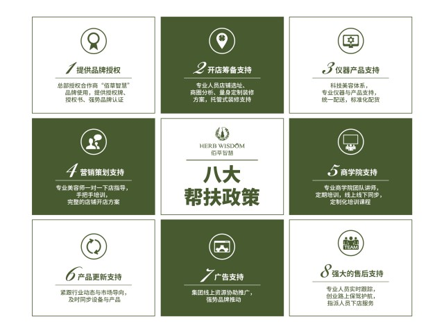 佰草智慧提供八大扶持政策,包括品牌授权、开店选址装修设计方案、产品仪器物流配送、营销策划支持、商学院支持、产品更新支持、广告媒介支持、强大的售后支持。八大政策涵盖开店经营全部流程,让每一位来佰草智慧的创业者少走弯路!